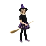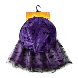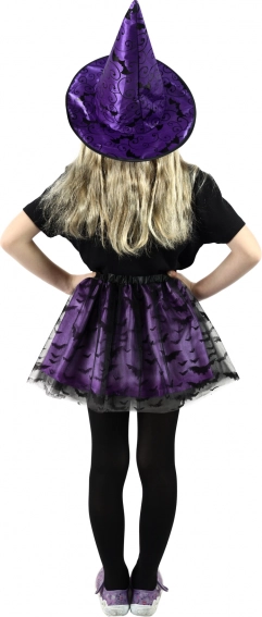 Ez a gyerek boszorkányjelmez játékos dizájnjával és kényelmes viseletével hódít. A könnyű tüllszoknya denevérmintával kb. 30 cm hosszú, és a rugalmas derékguminak köszönhetően könnyen alkalmazkodik az alkatra. A szett része egy hegyes kalap is azonos stílusban, amely teljessé teszi a varázslatos megjelenést.