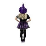 Könnyű, hegyes kalap lila–fekete kombinációban, amely stílusosan kiegészíti a jelmezt és fokozza a varázslatos hangulatot.