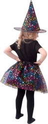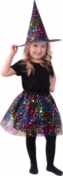 Ez az aranyos, fekete színű gyermek boszorkányjelmez színes csillagmintával díszített, amely azonnal magára vonzza a tekintetet. A szett része a pufi tüllszoknya kb. 30 cm hosszban és a hozzá illő hegyes kalap, melyekkel pillanatok alatt kis boszorkánnyá változik a gyerek.