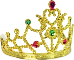 Az arany tiara különböző színű kövekkel van kirakva, köztük kiemelkedik a zöld és a piros. Ez a tiara királyi megjelenést kölcsönöz bármilyen öltözéknek.