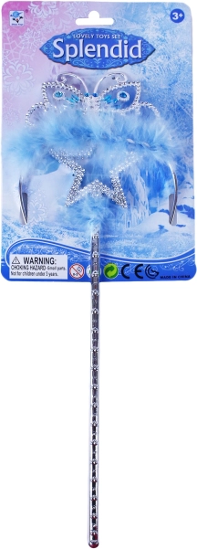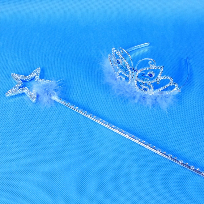 Ez az exkluzív készlet mindent biztosít, amire egy kis hercegnőnek szüksége van varázslatos kalandjaihoz. Tartalmaz egy gyönyörű ezüst fejdíszt kék kövekkel díszítve és egy elegáns pálcát. Mindkét elem finom kék tollakkal díszített, amelyek hozzájárulnak a szépséghez és a varázslathoz. Ideális hercegnő játékokhoz, jelmezbálokhoz és további kreatív tevékenységekhez.