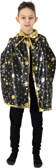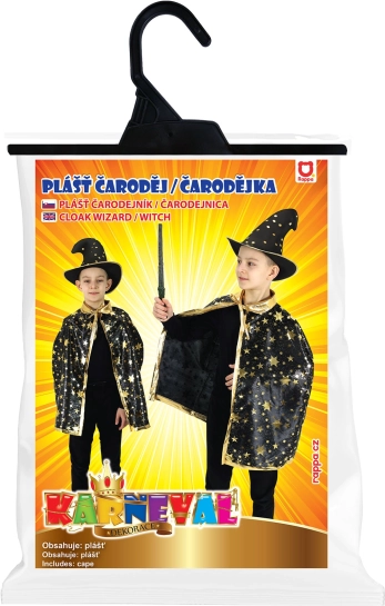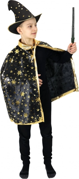 A kontrasztos fekete köpeny arany szegéllyel és csillagokkal feltűnő, elbűvölő megjelenést ad a kis varázslóknak és boszorkányoknak.