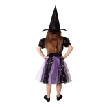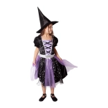 Ez a bájos boszorkány jelmez minden kis varázslatkedvelőt el fog ragadtatni. Elegáns feketét ötvöz varázslatos lilával, csillogó csillagokkal és könnyű tülllel a valóban mágikus megjelenésért. A hegyes kalap harmonizál a ruhával, így teljes szettet alkot farsangra, Halloweenre vagy iskolai műsorokra.