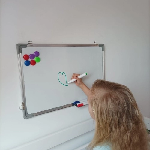 Ez a mágneses tábla ideális mindennapi használatra irodákban, iskolákban vagy otthoni környezetben. Felülete lehetővé teszi az egyszerű írást és rajzolást a mellékelt filcekkel, amelyeket az írás után könnyen eltávolíthat a mágneses szivaccsal. A tábla praktikus akasztókkal és kiegészítők polcával van ellátva, ahol minden szükséges eszközt elhelyezhet.