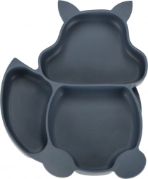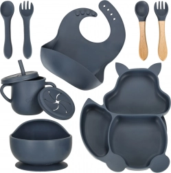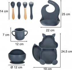 Teljes, 9 darabos szilikon étkészlet gyerekeknek mókus motívummal, sötétkék színben. Tartalmaz osztott tányért, tapadókorongos tálkát, kétféle tetővel és szívószállal ellátott poharat, előkét és puha evőeszközöket. BPA-mentes, tartós és mosogatógépben könnyen tisztítható – ideális az önálló étkezés kezdetéhez csúszásmentes tapadókorongokkal.
