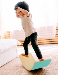 A LULILO AJLO egyensúlyozó deszka sokoldalú eszköz aktív játékhoz és otthoni edzéshez. Ívelt formájának köszönhetően természetes módon fejleszti a test stabilitását, erősíti a törzset (core) és javítja a testtartást. Az alsó türkiz filc stílusos megjelenést ad, egyben csillapítja a zajt és növeli a tapadást.