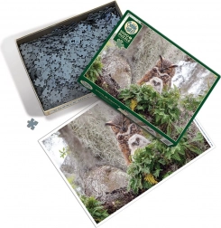 A zöld növényzetben ábrázolt felnőtt uhu és fióka részletgazdag megjelenítése fokozza a természet hangulatát, és a kirakót figyelemfelkeltő dekorációvá teszi.