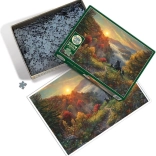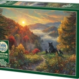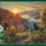 Egy erdei napfelkelte medvékkel és az ősz ragyogó színeivel, amely a kész kirakót gyönyörű dekorációvá varázsolja.