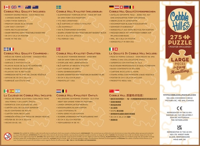 Fedezze fel a nyugodt kirakást a COBBLE HILL A tavacskánál XL, 275 darabos puzzle-lel. Az extra nagy elemek (kb. 3 cm) könnyen megfoghatók, remekül illeszkednek, és segítik a finommotorika és a koncentráció gyakorlását. A csomagban egy praktikus, 31,6 × 22,9 cm-es minta is található, amely megkönnyíti a részletgazdag jelenetben való tájékozódást.