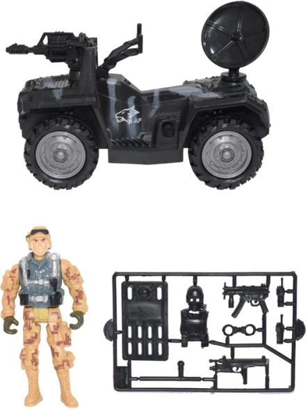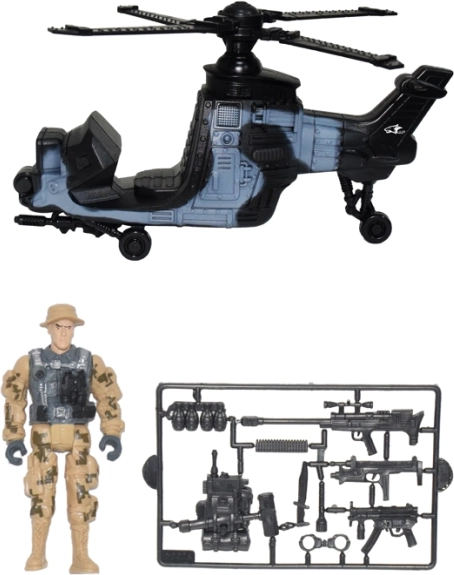 A készlet része a katona figura terepszínű ruhában és levehető kiegészítők, mint például fegyverek.