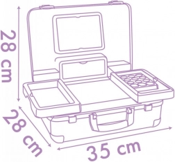 A bőrönd praktikus tükörrel, polcokkal, rekeszekkel és egy titkos rekesszel van felszerelve a kedvenc dolgok biztonságos tárolásához. Kompakt kialakítása révén könnyen hordozható, ami lehetővé teszi a fodrászat és sminkelés bárhol való játékát.