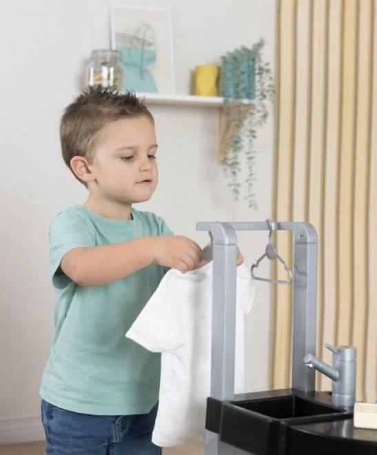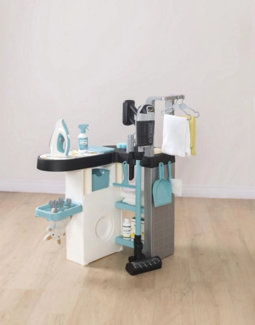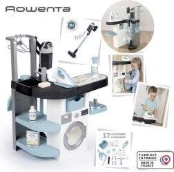 A gyermek mosoda vasalóval és Rowenta porszívóval tökéletes választás a kis házi segítőknek. Négy játék részből áll: mosógép, kézi mosáshoz mosdókagyló, szárító rész és vasalódeszka, amelyek tanítják a gyermekeket a háztartási feladatokra.