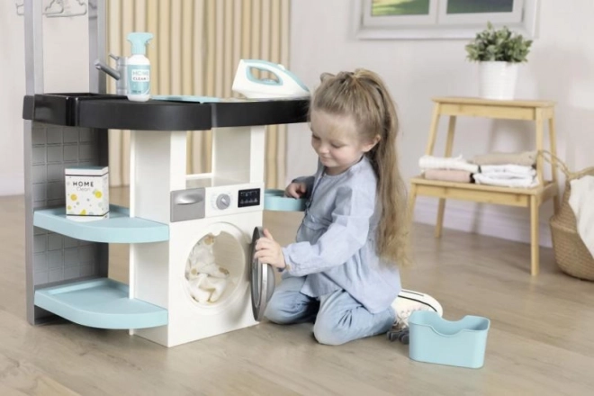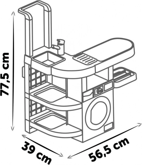 A gyermekek négy különböző részt használhatnak: mosógép, mosdókagyló, szárítófelület és vasalódeszka. Minden rész valódi játékhelyzetek kialakítására lett tervezve.