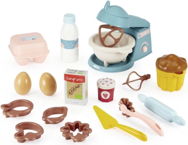 A komplett gyerek cukrászkészlet mindent kínál, amire a kis pékeknek szükségük van a kreatív játékhoz. Tartalmaz egy habverőt 2 cserélhető fejjel, sütőformát és szaggatókat, nyújtófát, derelyevágókat, tojást és egyéb élelem-maketteket. Összesen 19 darab a valósághű és szórakoztató játékhoz.
