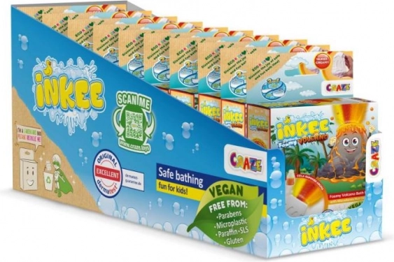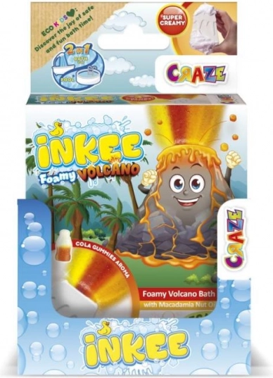 Az INKEE Foamy Volcano egy nagy, 110 g-os, vulkán alakú pezsgő fürdőbomba, amely vízbe dobva sárga, piros és narancssárga sugarakat lövell ki, így látványos kitörés-élményt teremt. Oldódás közben a vizet gyönyörűen narancssárgára színezi, és a fürdőszobát eper és kóla gumicukor illatával tölti meg.