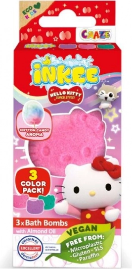 Fedezd fel a fürdés varázsát az Inkee Hello Kitty mini csomaggal. Három kis pezsgő bomba (3×15 g) játékos, színes fürdővé varázsolja a vizet, finom vattacukor illattal. A stílusos, ablakos csomagolás örömet szerez a gyerekeknek és a HELLO KITTY rajongóknak, és remek apró ajándék.