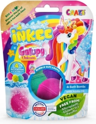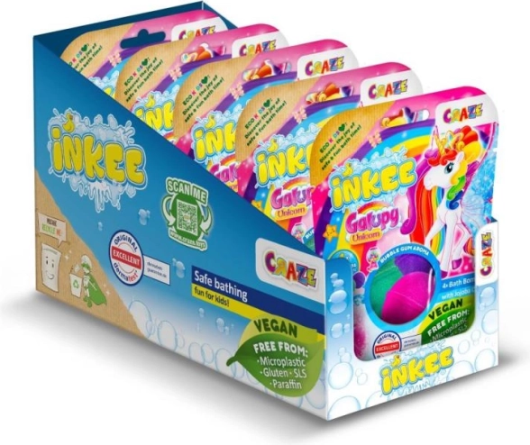 Varázsolj mágikus fürdőélményt az INKEE bombákkal! A szett 4 pezsgő fürdőbombát tartalmaz négy színben – rózsaszín, lila, türkiz és sárga – játékos rágógumi illattal és ápoló jojobaolajjal. Dermatológiailag kímélő, vegán, mikroműanyag-mentes, és nem fogja meg a bőrt, a hajat vagy a kádat.
