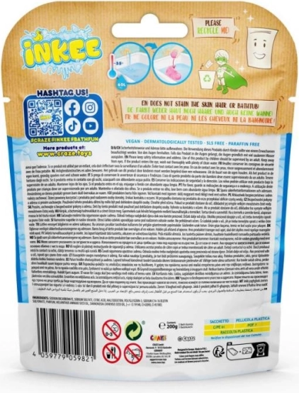 Az INKEE termékeket a gyerekek és a természet iránti odafigyeléssel tervezték – vegánok, mikroműanyag-mentesek, SLS-mentesek, paraffinmentesek, és 3 éves kortól ajánlottak. Praktikus, ablakos tasakban csomagolva a szín könnyű kiválasztásához.