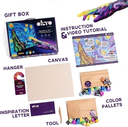 Fedezze fel a kreatív élményt a Okto Sensoty Art – Csillagos éj képzőművészeti készlettel, amelyet Vincent van Gogh mesterműve inspirált. A levegőn száradó gyurma (air clay) és az ujjfestés technika segítségével domború képet hozhat létre, 4/5 nehézségi szinttel. Ideális a kreativitás fejlesztésére és a relaxációra, 30 × 40 cm vászonnal és mindennel, amire a csomagban szüksége van.