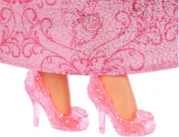 A baba rózsaszín ruhába van öltöztetve csillogó részletekkel és díszítéssel, amely a filmben látható Aurora megjelenését idézi.