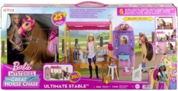 Fedezd fel a lovas világ varázsát a Barbie Ultimate Stable játékszettel, amelyet a Barbie Mysteries: The Great Horse Chase sorozat ihletett. Több mint 25 elem és 6 játékrész kínál végtelen kreatív játékot – az etetéstől és lógondozástól a ugróedzésen át a trófeák kiállításáig. A ló hosszú sörénnyel és farokkal rendelkezik fésüléshez és stylinghoz, a baba térdei hajlanak a valósághű lovagláshoz, az istálló pedig könnyen összecsukható a tároláshoz.