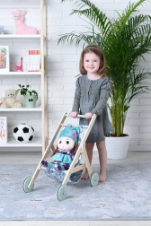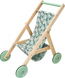A könnyű fa babakocsi időtálló, természetes anyagot ötvöz játékos, leveles mintájú textil üléssel. A sima fogantyúk és a halk kerekek kényelmes tolást biztosítanak a lakásban, miközben a strapabíró szerkezet biztonságot és stabilitást nyújt játék közben.