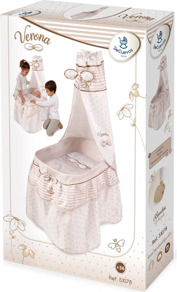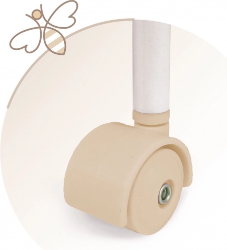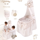 Ez a stílusos babaágy lágy pasztell bézs és fehér árnyalatokban készült, visszafogott pöttyökkel és csíkokkal. A természetes megjelenést virágsziromra emlékeztető masnik és apró, méhecskés hímzések egészítik ki, amelyek kiemelik a teljes VERONA kollekció báját. A forgó kerekeknek köszönhetően az ágy könnyen áthelyezhető egyik szobából a másikba, így a kis gondoskodó mindig maga mellett tudhatja a babáját.