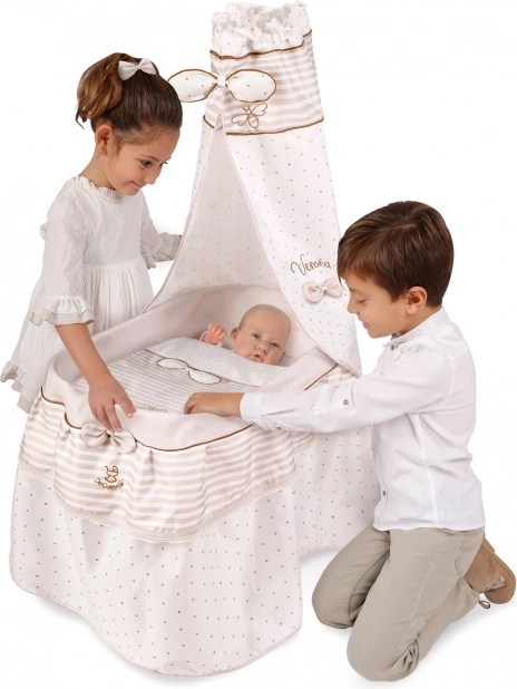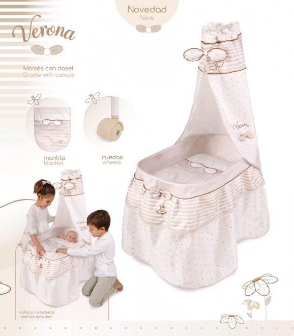 Elegáns, guruló babaágy a VERONA kollekcióból, finom természetes dizájnnal, masnis baldachinnal, kényelmes takaróval és 4 forgó kerékkel a könnyű manőverezéshez. Precíz kivitelezés, könnyű kezelhetőség és biztonságos anyagok – öröm minden kis anyukának.