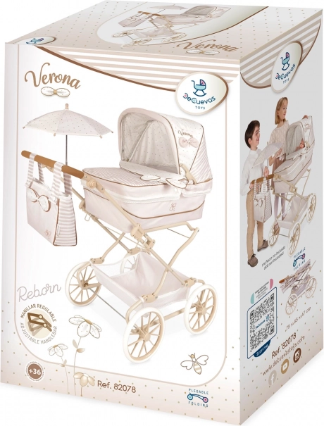 Elbűvölő REBORN Verona 2024 babakocsi világos bézs és fehér kombinációban, finom pöttyökkel és csíkokkal, amely a precíz spanyol kivitelével és időtlen dizájnjával hódít. A magasságban állítható tolókar (65–90 cm) révén tökéletesen alkalmazkodik a gyermek növekedéséhez, és könnyen irányítható.