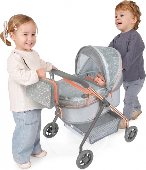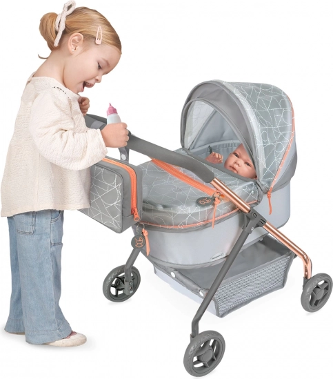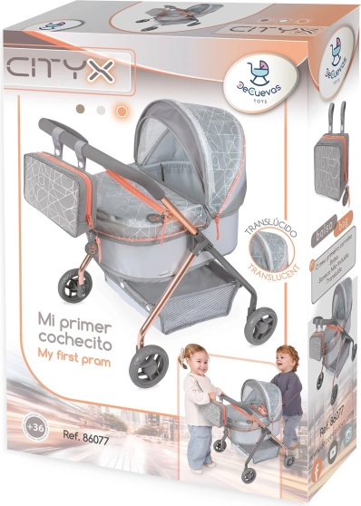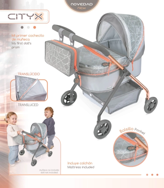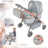 A CITY X 2024 kollekció prémium textíliákat ötvöz nyomott PVC-vel, amely „üvegszerű” felületeket idéz. Az elegáns szürke–ezüst kivitelhez trendi réz elemek társulnak, kiemelve a babakocsi könnyedségét és légies megjelenését. A alacsony tolókarnak és a stabil váznak köszönhetően a legkisebbeknek is ideális, tökéletes a szerepjátékhoz és a fantázia fejlesztéséhez.