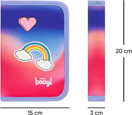 A praktikus BAAGL iskolai tolltartó piros kivitelben, szivárvány mintával, ideális a mindennapi használatra. Az áttekinthető belső elrendezés két belső füllel megkönnyíti a ceruzák, tollak, radír vagy vonalzó rendszerezését, míg a minőségi cipzár megbízható zárást biztosít.