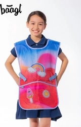 Fedezze fel a megbízható ruhavédelmet a kis alkotóknak. A piros szivárványos mintájú BAAGL gyerekkötény ideális iskolába és otthonra – rajzórára, technikára, sütéshez és kézműveskedéshez. A játékos dizájn szórakoztatja a gyerekeket, és egyenesen alkotásra ösztönzi őket.