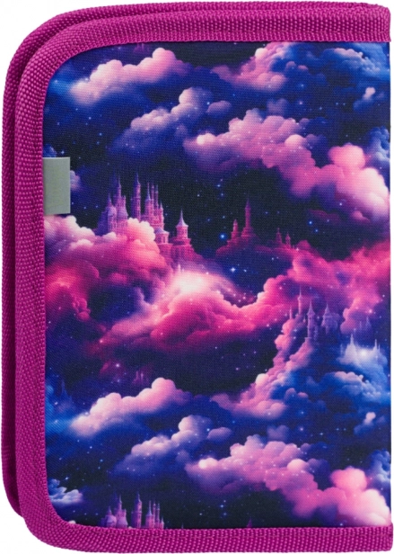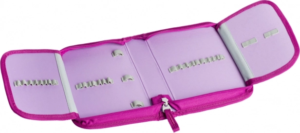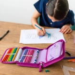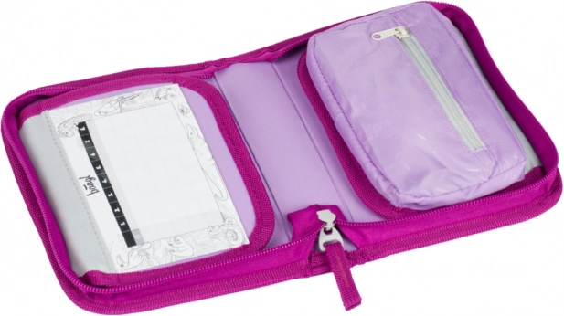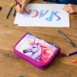 Az elülső oldalt részletgazdag egyszarvú motívum díszíti rózsaszín–lila árnyalatokban, amely feltűnő kiegészítővé teszi a tolltartót az iskolában.