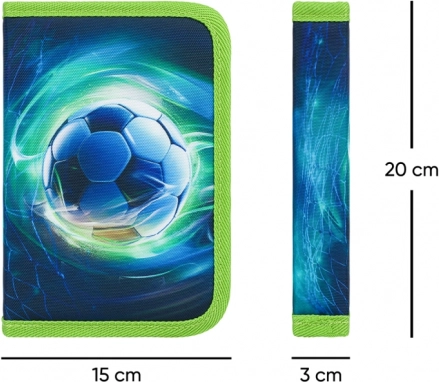 Az előlapot egy markáns futball-labda motívum díszíti kék–zöld kombinációban – remek választás a kis focistáknak.