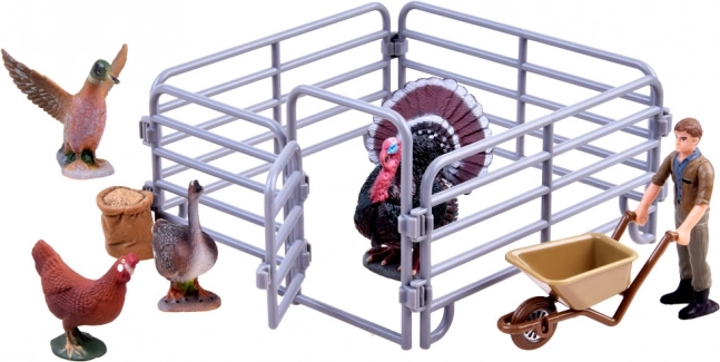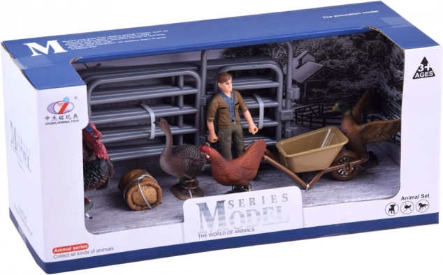 A csomagban pulyka, kakas, liba, kacsa, talicskás gazda, etető és karámelemek találhatók, amelyekkel a gyerekek könnyedén megalkothatják saját mini farmjukat, és eljátszhatják a mindennapi teendőket, etetést és állatgondozást.