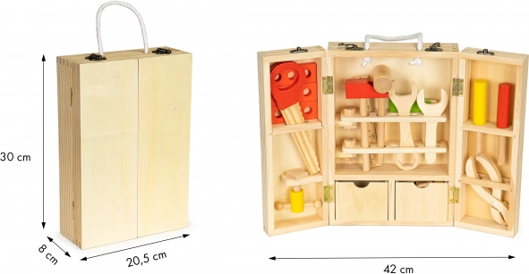 Ez az egyedülálló ECOTOYS szerszámkészlet nemcsak szórakoztató, hanem oktató jellegű is. Minőségi fából készült és tartalmaz: