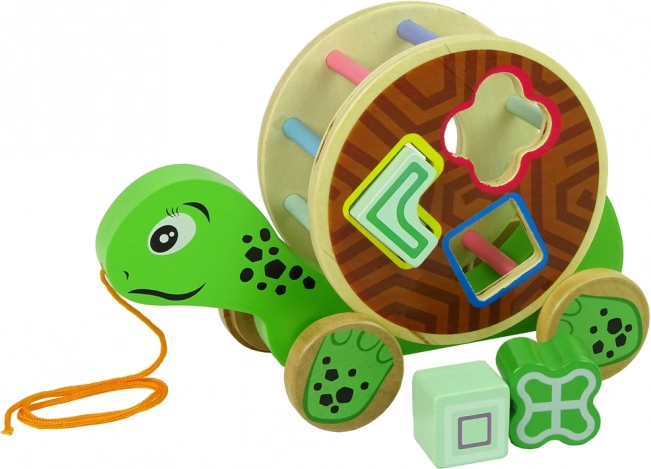 Ez a bájos teknős minden lépésnél elkíséri gyermekét. A hátán lévő forgó dob bedobónyílásokkal támogatja a színek és a geometriai formák megismerését, míg a húzózsinór motivál az első sétákra. A kockák belsejében hanghatás (csörgő) található, amely serkenti a hallást és növeli a játék iránti érdeklődést.