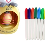 A cuki nyuszi állvány és segítő a díszítéshez a tojásfestést az egész család számára szórakozássá varázsolja. A készletben találsz 3 műanyag tojást, 8 színes filcet és egy nyuszi alakú állványt. A tojások könnyűek, biztonságosak és nem mérgezőek, ideálisak gyerekek kreativitásához és húsvéti dekorációhoz. 3 éves kortól ajánlott, CE tanúsítvánnyal.