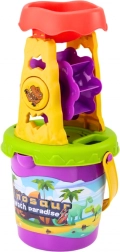 Minden egyben: vödör malommal, szitával és tölcsérrel, lapát, gereblye, locsolókanna és két forma a végtelen szórakozáshoz strandon és homokozóban.