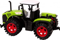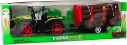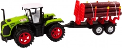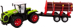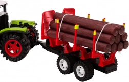 A zöld traktor piros kerekekkel és rönkszállító pótkocsival az agrárgépek hiteles megjelenését hozza el, és ösztönzi a képzeletbeli játékot.