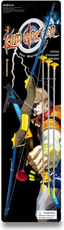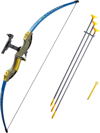 A készlet tartalmaz egy impozáns íjat, amely 102 cm hosszú, és vonzó kék színekben készült sárga és arany kiegészítőkkel. Három nyíl szürke-sárga színkombinációban, gumis végződéssel, ami biztonságos használatot biztosít és minimalizálja a sérülés kockázatát.