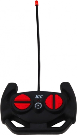 Fekete és piros távirányító 'R/C' jelöléssel könnyű kezelhetőséget biztosít alapvető mozgásokkal, ami kiváló élményt nyújt vezetés közben.