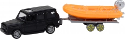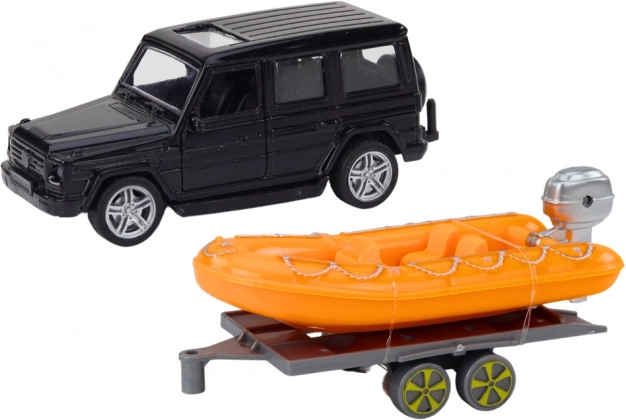 Ez a szett ötvözi a terepjárót és a csónakos utánfutót, ideális gyermekek számára, akik szeretik a kalandokat minden terepen.