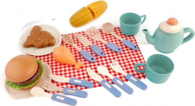 A csomag tartalmaz műanyag edényeket, teáskannát, evőeszközöket és tányérokat, amelyek ideálisak a kis kezek számára, biztosítva a könnyű kezelhetőséget és a nagyobb szórakozást.