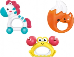 Játékok csörgő elemeket tartalmaznak, amelyek hangot adnak ki rázáskor, segítve a hallás, a baba kíváncsiságának és motorikus képességeinek fejlődését. Ezenkívül gumis részekkel is fel van szerelve, amelyek rágóka szerepét töltik be. Ezek a biztonságos, puha elemek ideálisak rágcsálásra, enyhülést nyújtva a fogzás időszakában.