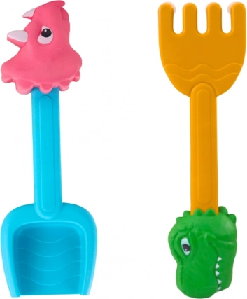 Praktikus szerszámkészlet vidám mintákkal. A gyerekek könnyedén ásnak vele, elegyengetik a homokot, és szilárd alapokat készítenek az építményekhez.