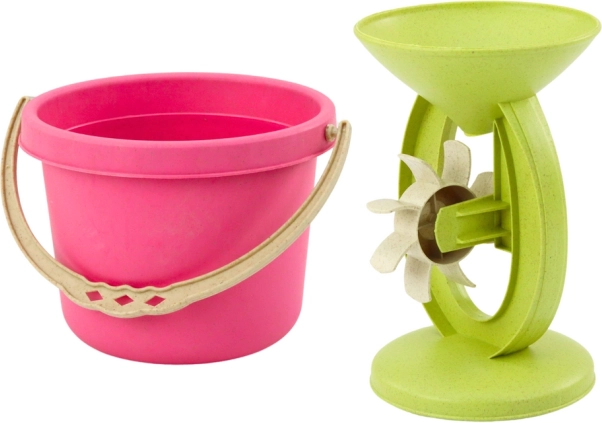 Öntsön vizet vagy szórjon homokot, és figyelje, ahogy a malom kerekei megforognak. A vödör erős füle megkönnyíti a víz és a homok szállítását.