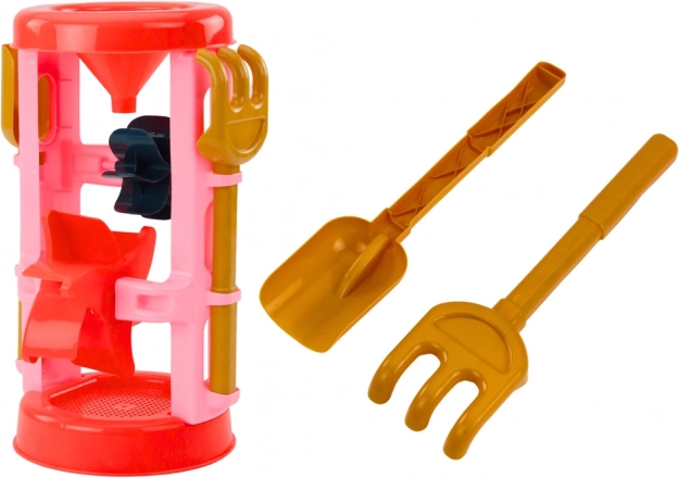 .A homokozójáték készlet ideális a gyerekeknek, akik szeretnek a strandon vagy a homokozóban játszani. A készlet központi eleme egy nagy malom, amely rengeteg szórakozást és kreatív játéklehetőséget kínál. A malmot sokoldalúságra tervezték: az egyik oldalán szita található a homok átszitálásához, a másik oldalán pedig tölcsér, amelyen keresztül a homok szabadon áramolhat és meghajthatja a malom kerekeit.