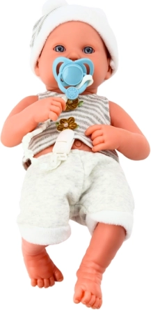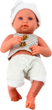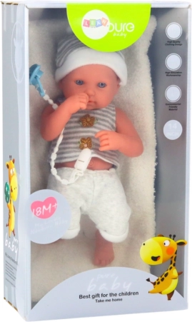 A bájos baba fehér–szürke öltözékben a kicsi gondoskodókat valósághű megjelenéssel és kiegészítőkkel örvendezteti meg. Mozgatható karokkal és lábakkal, zsinóron lévő cumival és puha takaróval érkezik a bújáshoz. Biztonságos anyagokból készült, fejleszti az empátiát, a finommotorikát és a kreatív játékot.