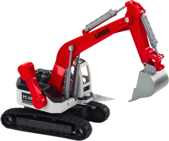 Fém lánctalpas kotrógép piros-fehér kialakítással, valósághű részletekkel és forgatható vezetőfülkével biztosítja a játék hitelességét. Ideális a kis építők számára.